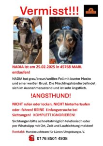 Nadia konnte am 02.03. in Recklinghausen gefangen werden. ❤️Danke an das Team von Hundesuchteam für Lünen/Umgebung e.V. und 4Pfotensicherung 🙏———————————————————❗️❗️❗️KEINE EINFANGVERSUCHE! NICHT rufen oder locken,…