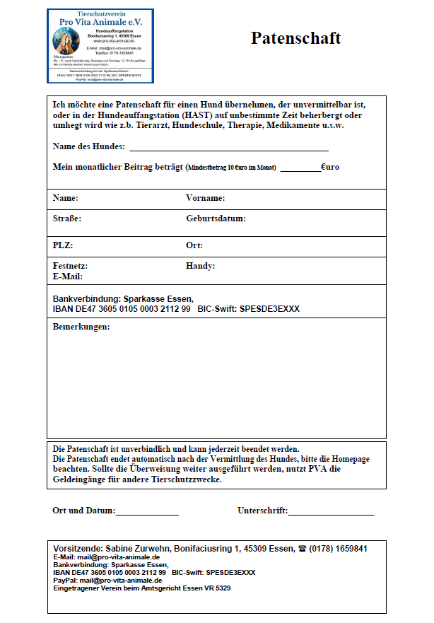Hier kann der Patenschaftsantrag von Pro Vita Animale e.V. heruntergeladen werden.