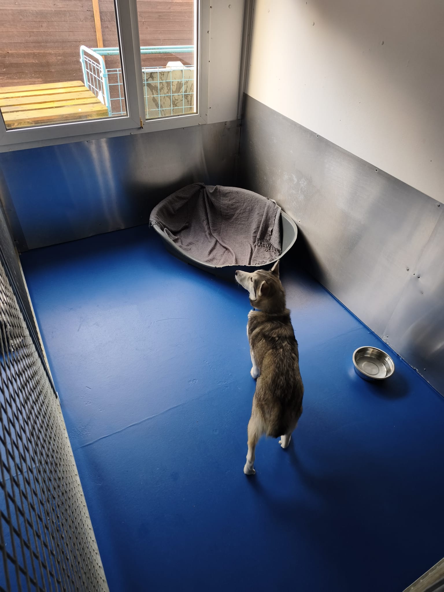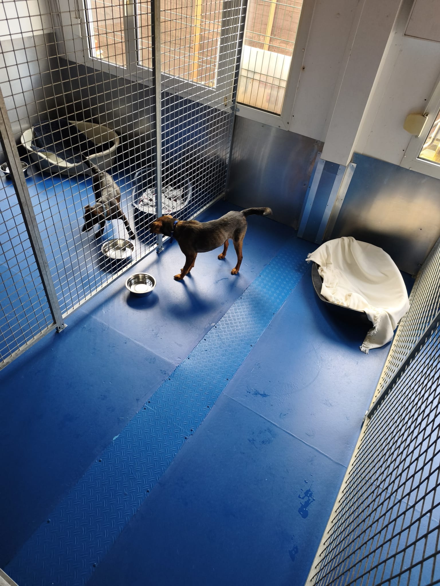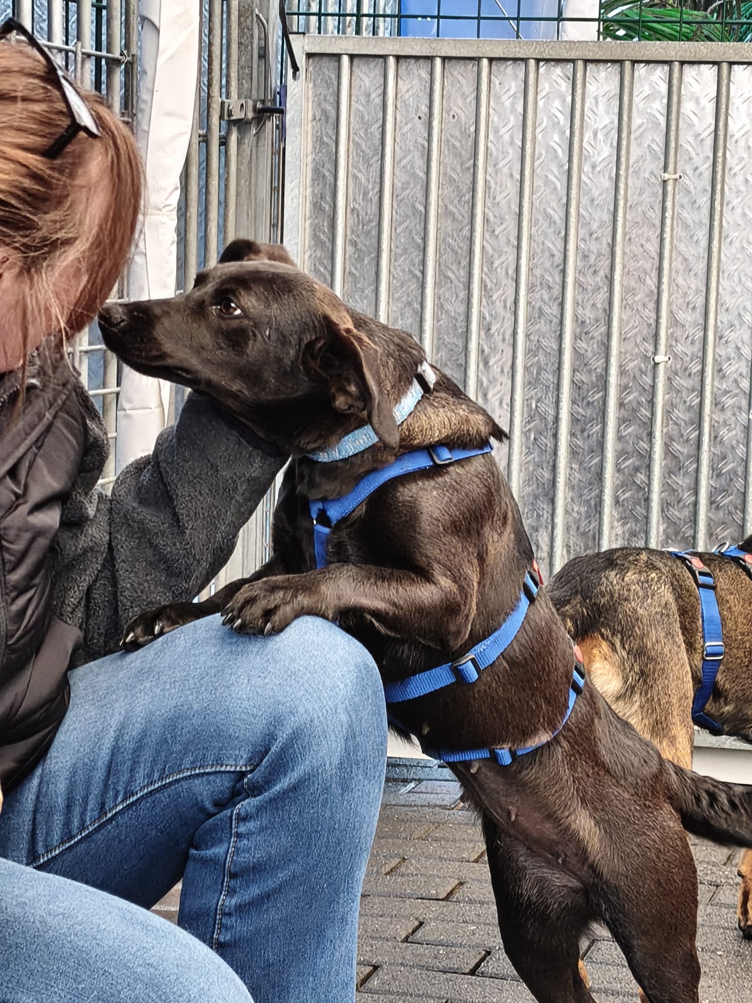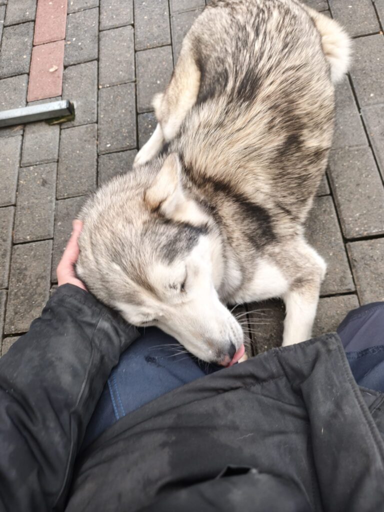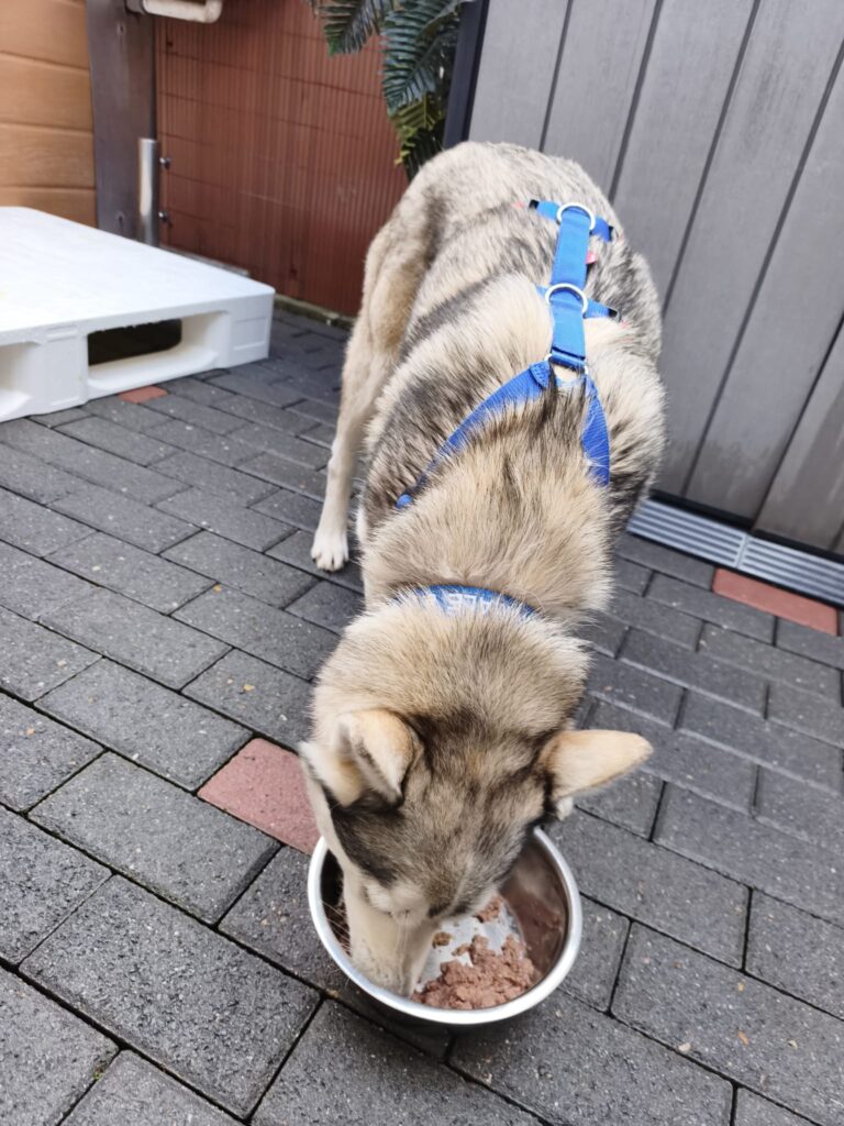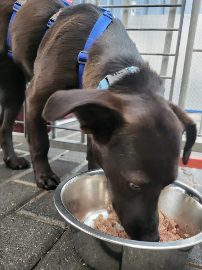 Nach dem ersten Kuscheln und Erkunden kam dann der Teil, den wirklich niemand mag: Halsbänder anlegen, Geschirre anprobieren, wiegen, messen… nicht gerade die Lieblingsbeschäftigung eines Hundes. Aber ein gut gefüllter Napf, der in Rekordzeit verschlungen wurde, hat uns schnell wieder verziehen.