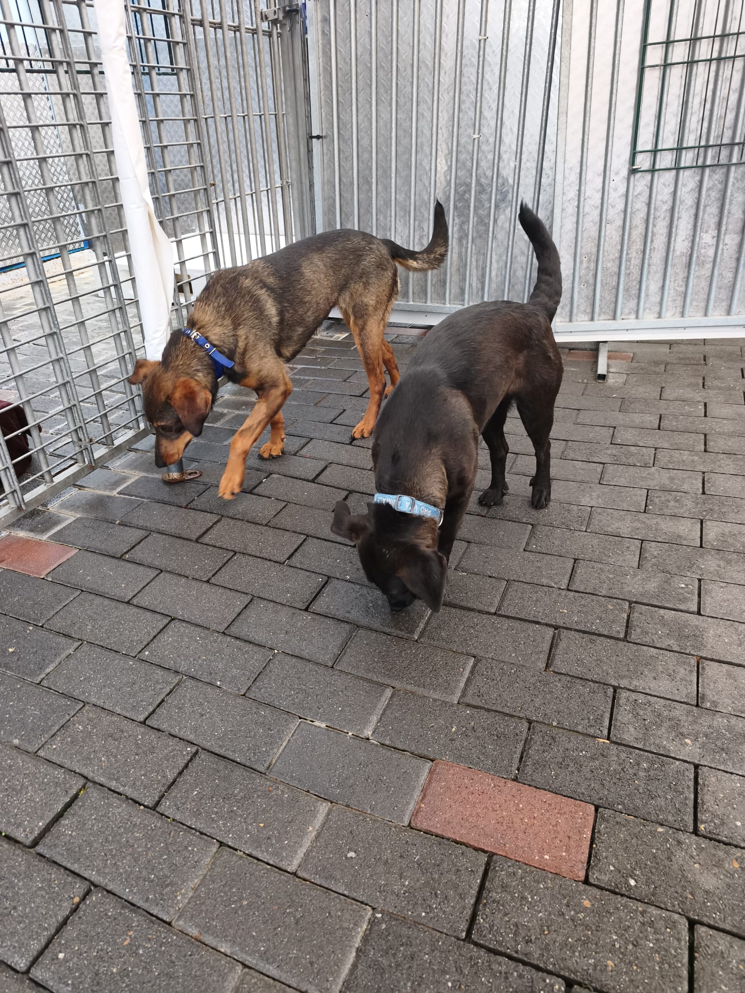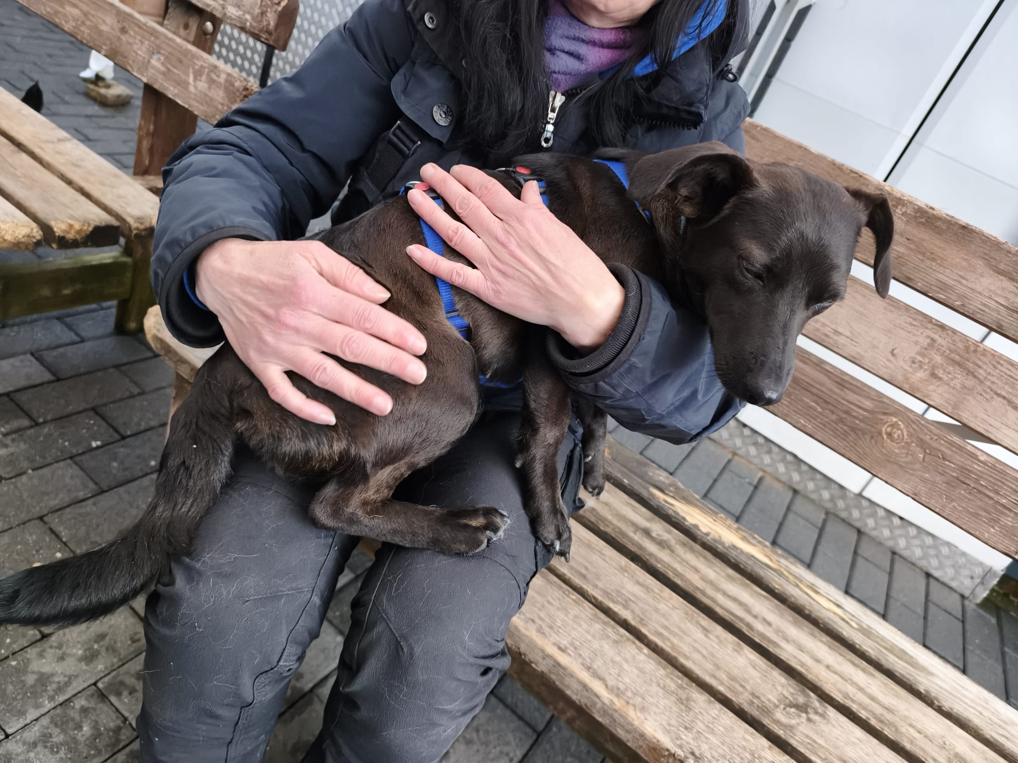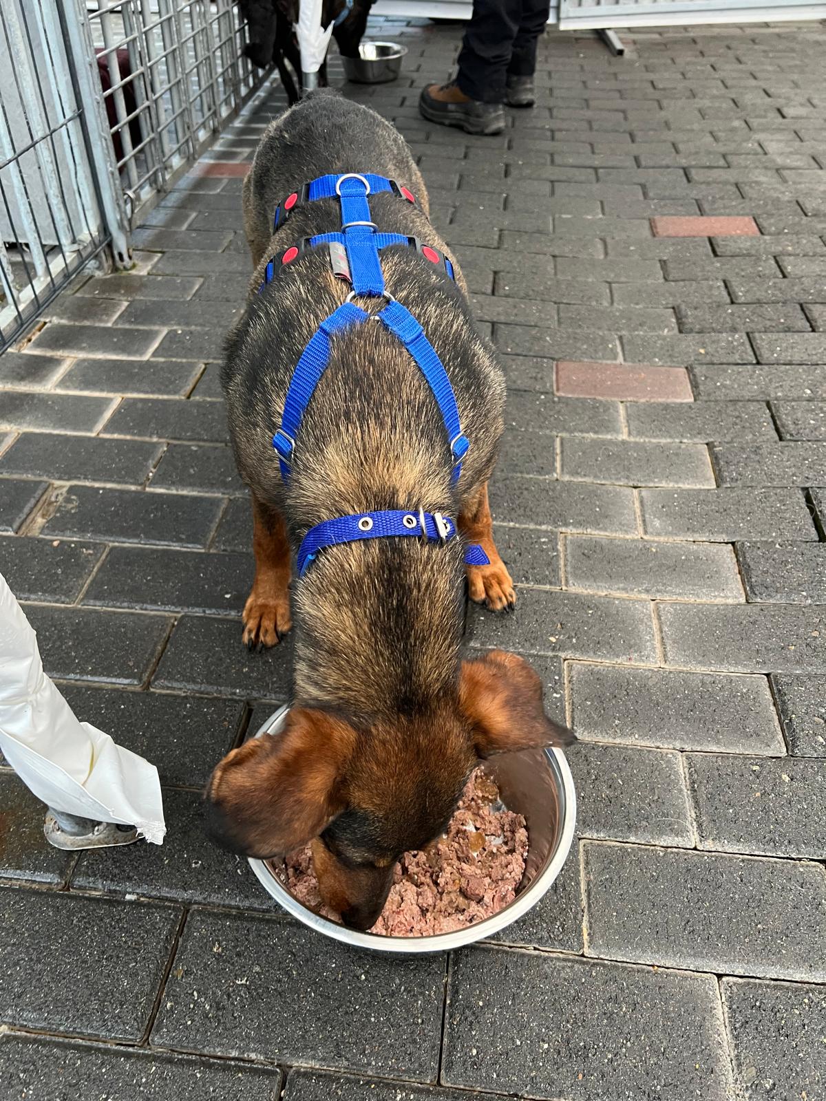 Nach dem ersten Kuscheln und Erkunden kam dann der Teil, den wirklich niemand mag: Halsbänder anlegen, Geschirre anprobieren, wiegen, messen… nicht gerade die Lieblingsbeschäftigung eines Hundes. Aber ein gut gefüllter Napf, der in Rekordzeit verschlungen wurde, hat uns schnell wieder verziehen.