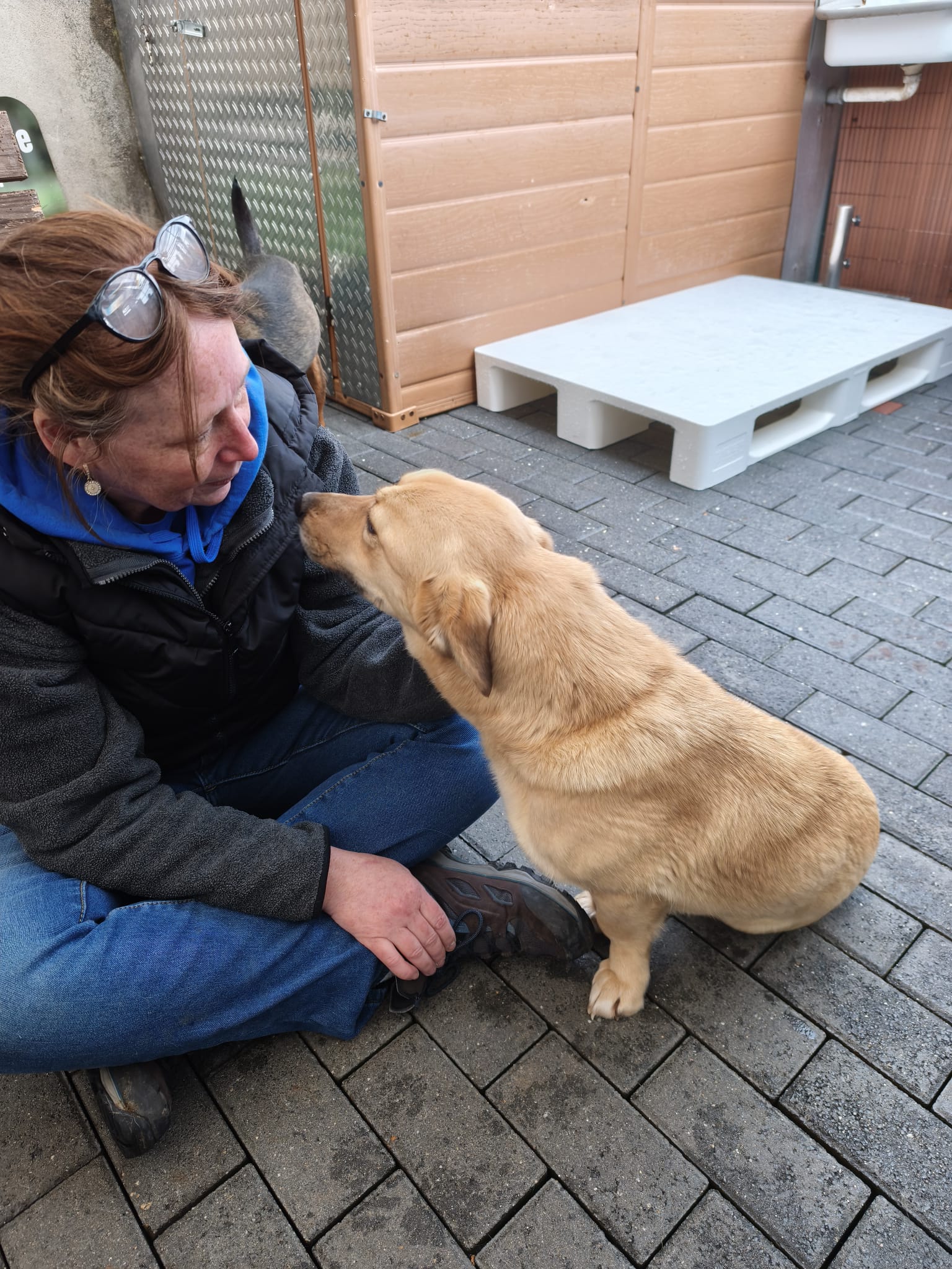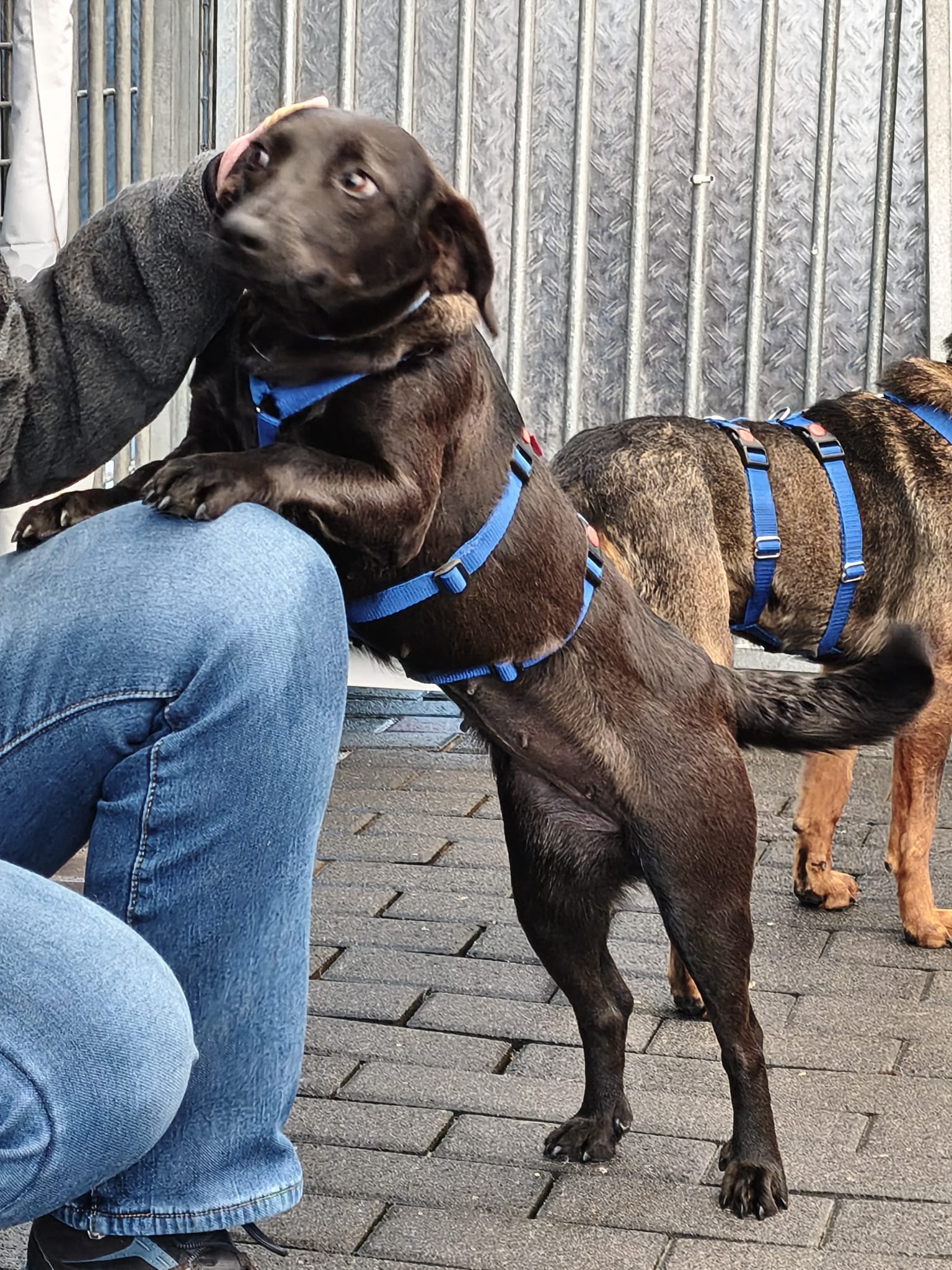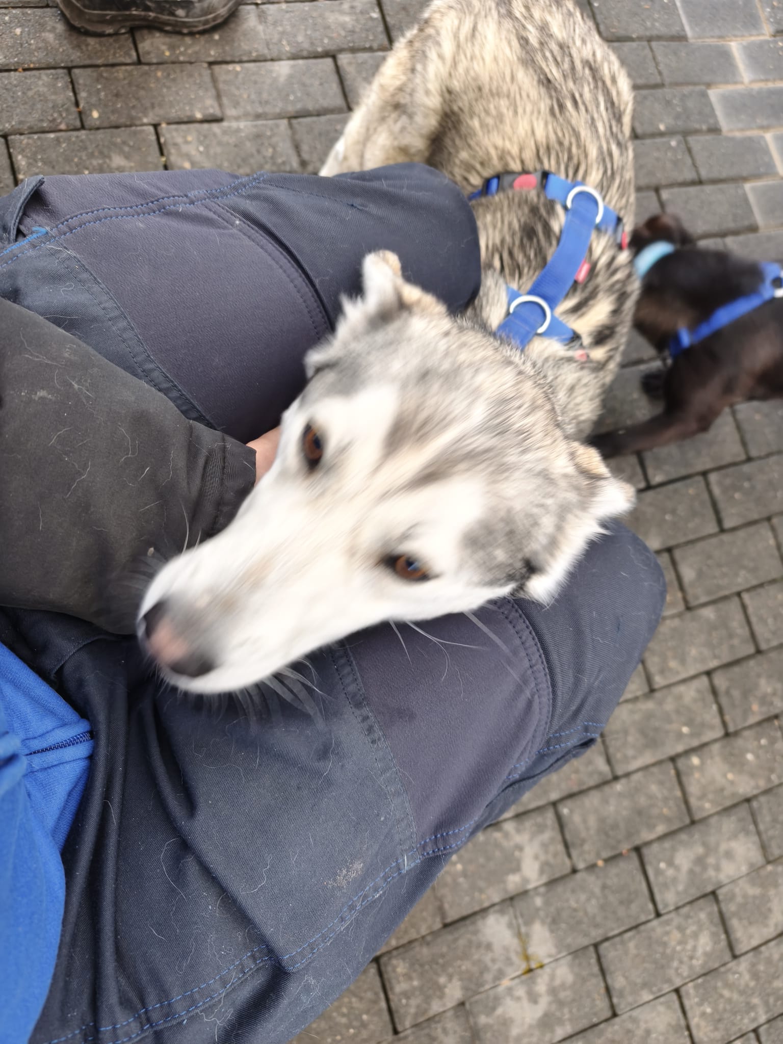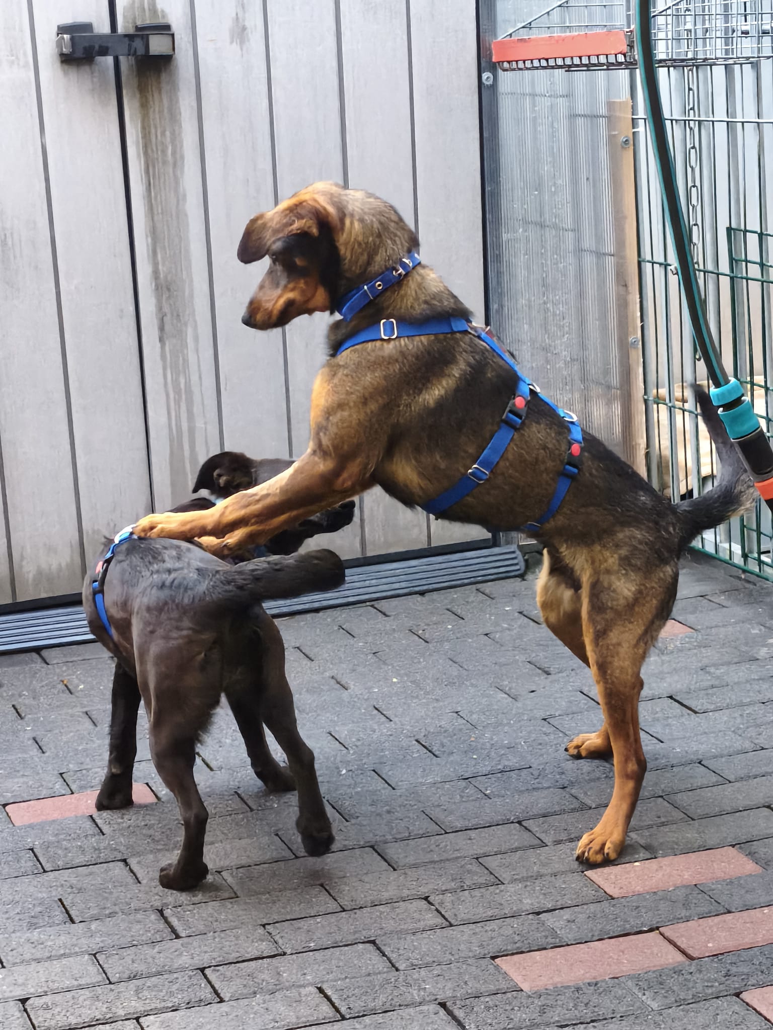 Nach dem ersten Kuscheln und Erkunden kam dann der Teil, den wirklich niemand mag: Halsbänder anlegen, Geschirre anprobieren, wiegen, messen… nicht gerade die Lieblingsbeschäftigung eines Hundes. Aber ein gut gefüllter Napf, der in Rekordzeit verschlungen wurde, hat uns schnell wieder verziehen.